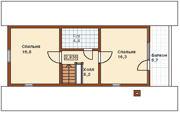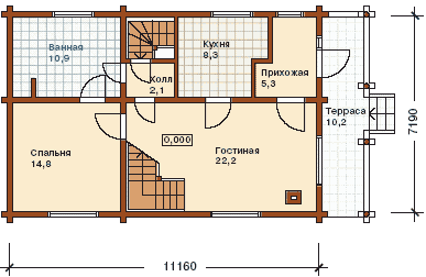 Невеликий дерев'яний будинок добре буде виглядати на ділянці серед дерев. Планування будинку передбачає досить комфортний відпочинок і постійне проживання сім'ї з 3-4 чоловік. Тераса на вході спроектована під загальну покрівлю, таке рішення створює додаткові зручності в негоду. Передпокій служить буфером між вулицею і житловим простором. У вітальні передбачений камін. Сходи, що ведуть на другий поверх, збагачує і розширює інтер'єрні можливості вітальні. Спальня має власний вхід в простору ванну кімнату. У будинку запроектований невеликий підвал, розташований під кухнею. Другий поверх займає мансарда з двома спальнями і санвузол. Одна спальня має вихід на балкон. Завдяки мансардних вікон все приміщення другого поверху отримають в надлишку денне світло.